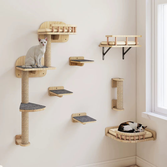 7-Piece Wooden Cat Climbing Set - Wall-Mounted with Scratching Posts, Corner Platform, Stairs & Bed for Play/Sleep